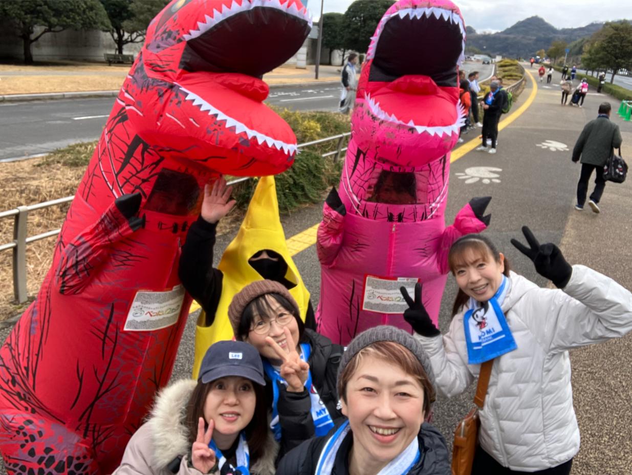 亀川から帰ってくる選手達を応援したくてうみたまご付近の沿道で待機中にティラノサウルスとバナナさんに遭遇。